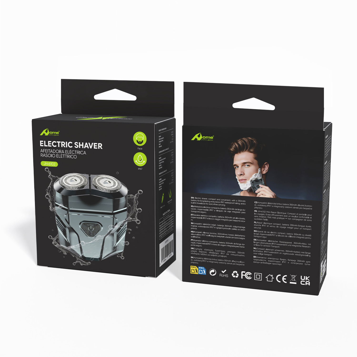 Afeitadora doble eléctrica recargable diseñada para uso versátil, ideal para distribución en canal profesional y retail. Su diseño impermeable y su autonomía prolongada garantizan un rendimiento fiable y práctico para el uso diario.